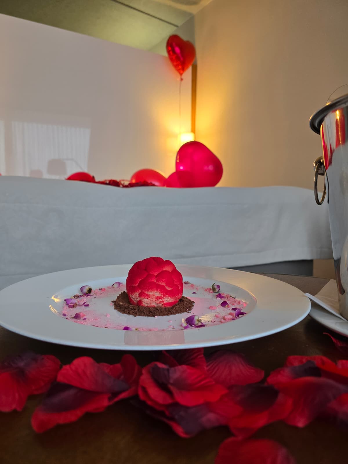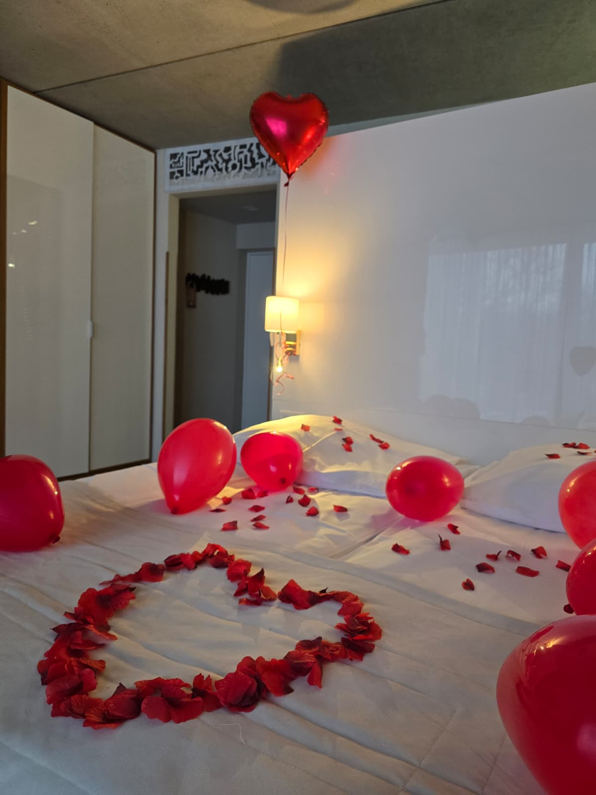 - romantyczne przystrojenie pokoju balonami oraz płatkami róż